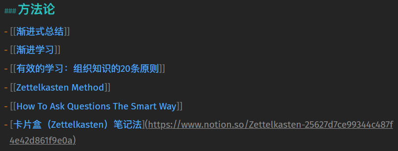 这意味着每当使用一个[[ ]]时,便是将当前文档和方括号中引用的文档链接了起来,即建立了索引。当下一次回顾该文档时,便能够清晰地查看文档间的关系。